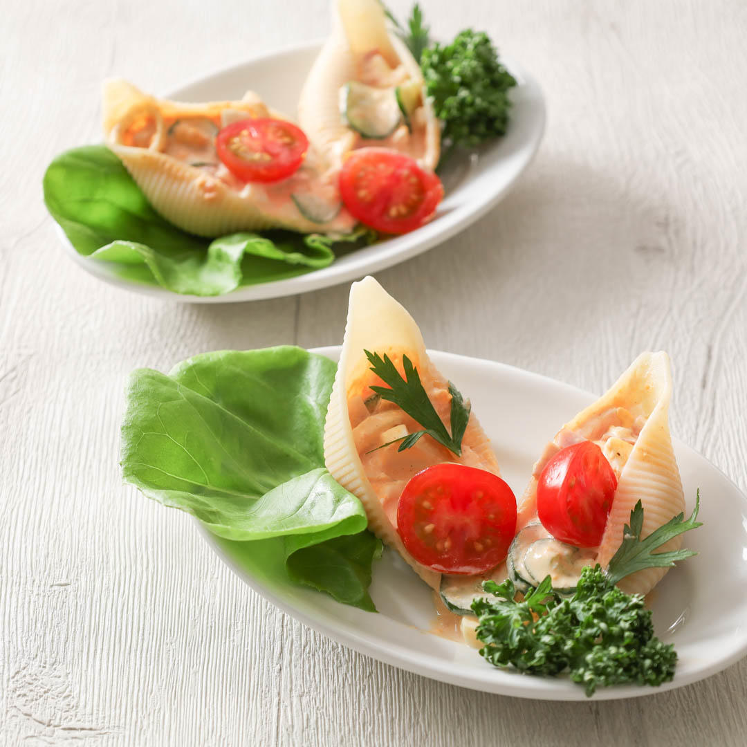 イタリア語でコンキリアが『貝』、オーニが『大きい』という意味から『大きい貝』を意味する通り、まさに貝の形をしたパスタ。マヨネーズで味付けしたサラダを詰めた、形もかわいいフィンガーサラダです。ピクニックや運動会のお弁当などにもおすすめです。