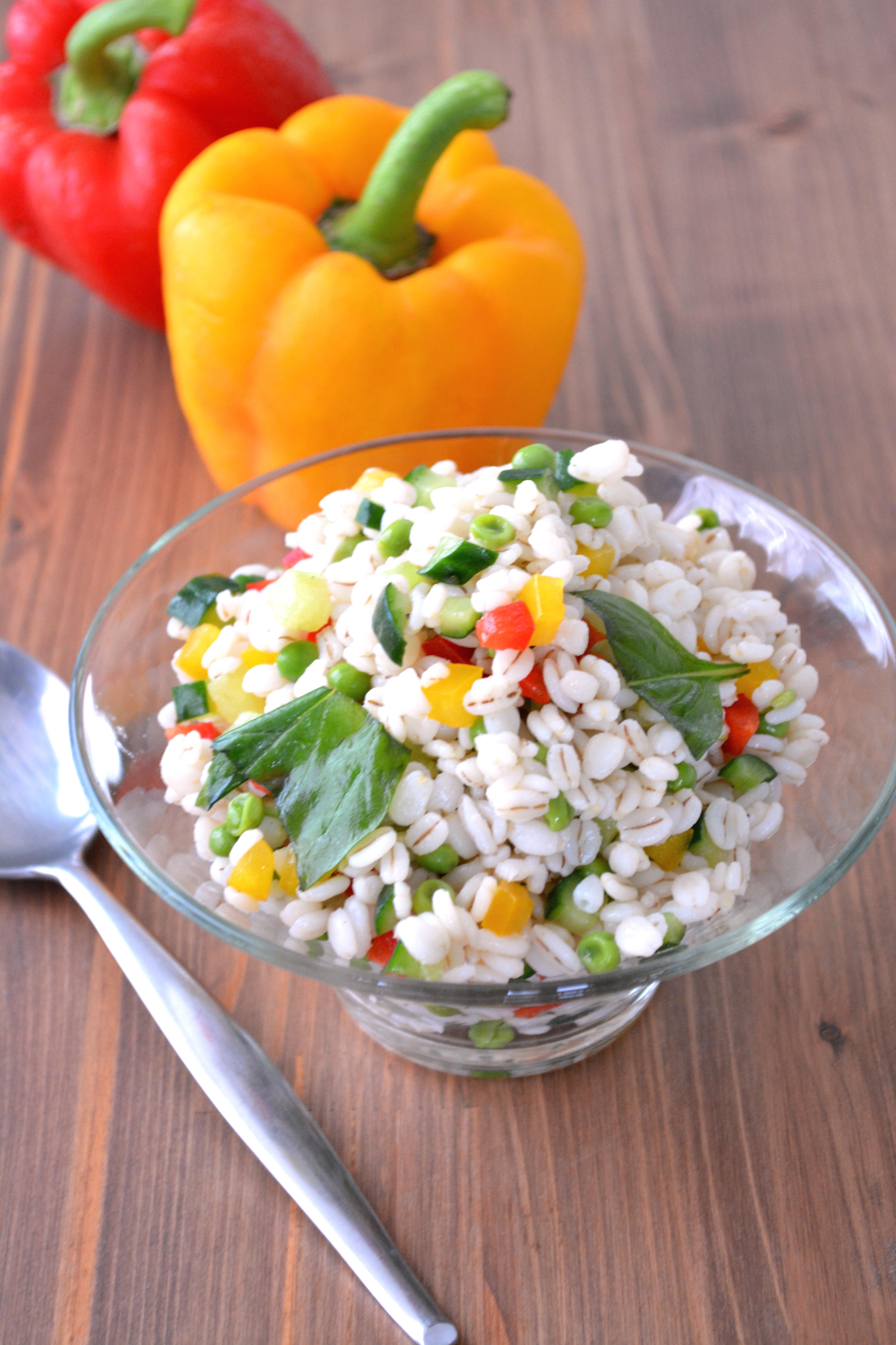茹でた押し麦と切った野菜をまぜるだけの簡単サラダ。食物繊維たっぷりのサラダで夏バテ解消におすすめです!