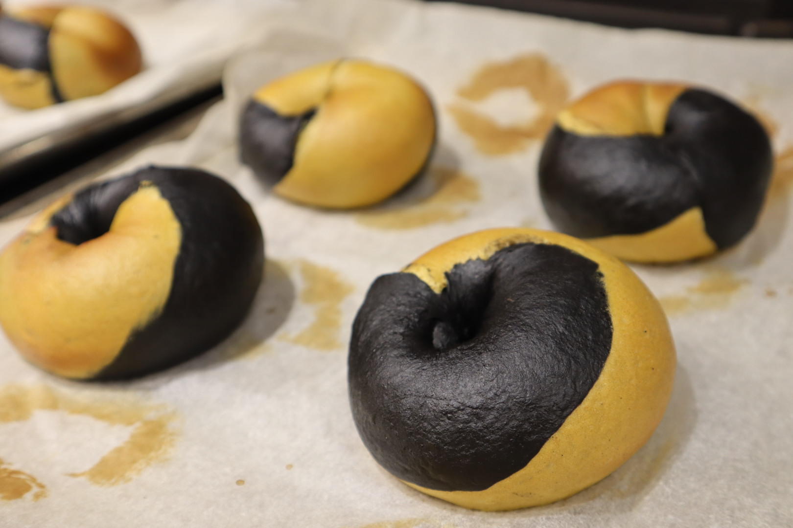 カボチャとイカスミで2色に仕上げたハロウィンにぴったりのベーグル。サッコロッソ粉を使うとぎゅっとモチモチ食感に!生地を噛みしめるとほんのりイカスミの香りがするので、お食事にぴったりのベーグルになります。