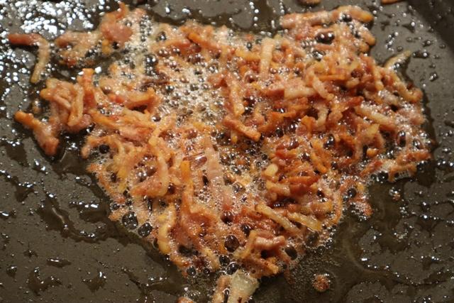 フライパンにオリーブオイルを引き、グアンチャーレ(またはベーコン)を加え、中火でカリカリになるまで炒める。