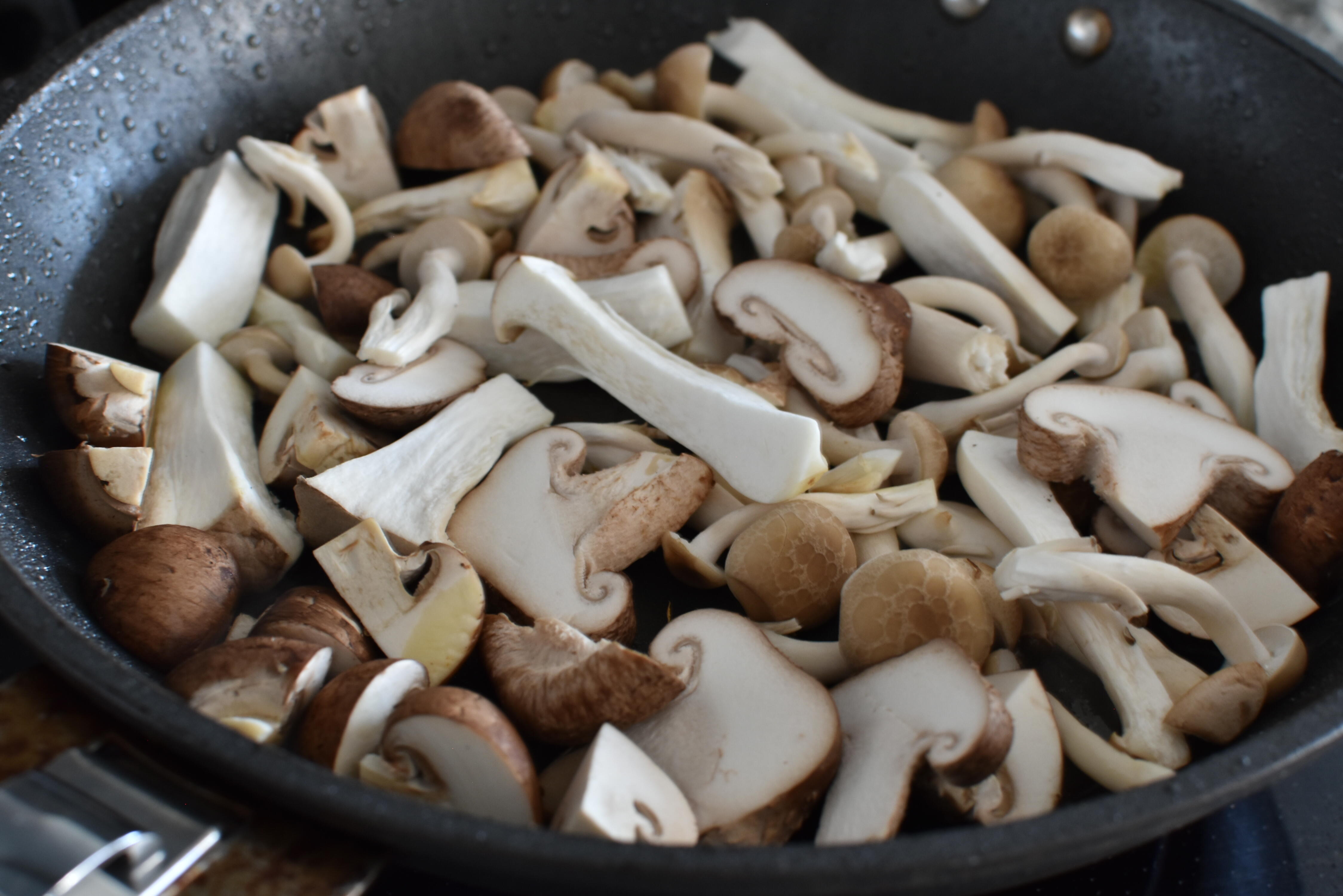 キノコは大きめにカットする。④のフライパンを再度温め、キノコ類を入れ、焼き色がつくまで動かさずにしっかりと炒める
