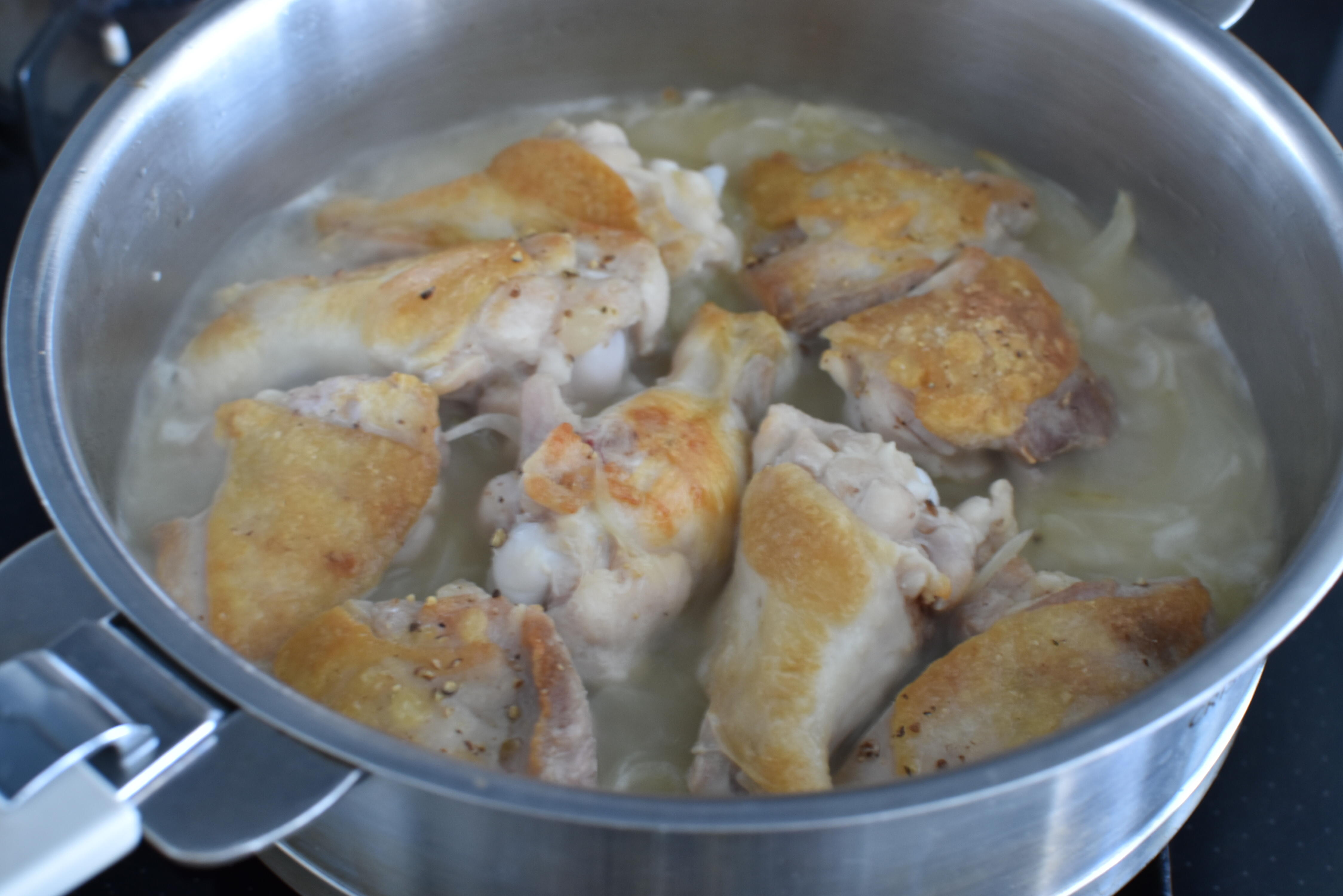 チキンブイヨンとローリエを加え、蓋をして110分ほど煮込む。
