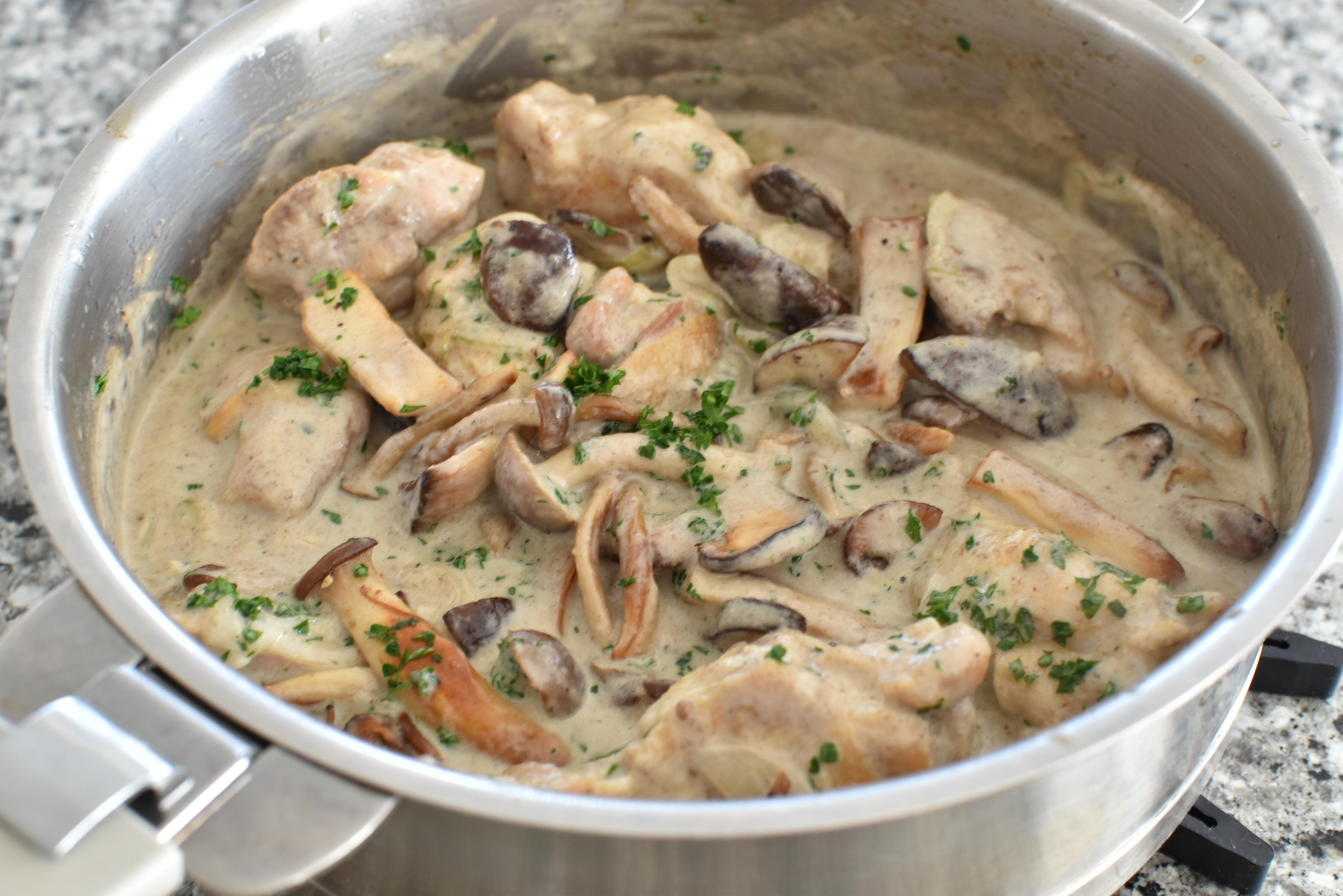 フレンチマスタードを加え、鶏肉を戻し、⑦の炒めたキノコも加え、味を馴染ませる。パセリを加える。