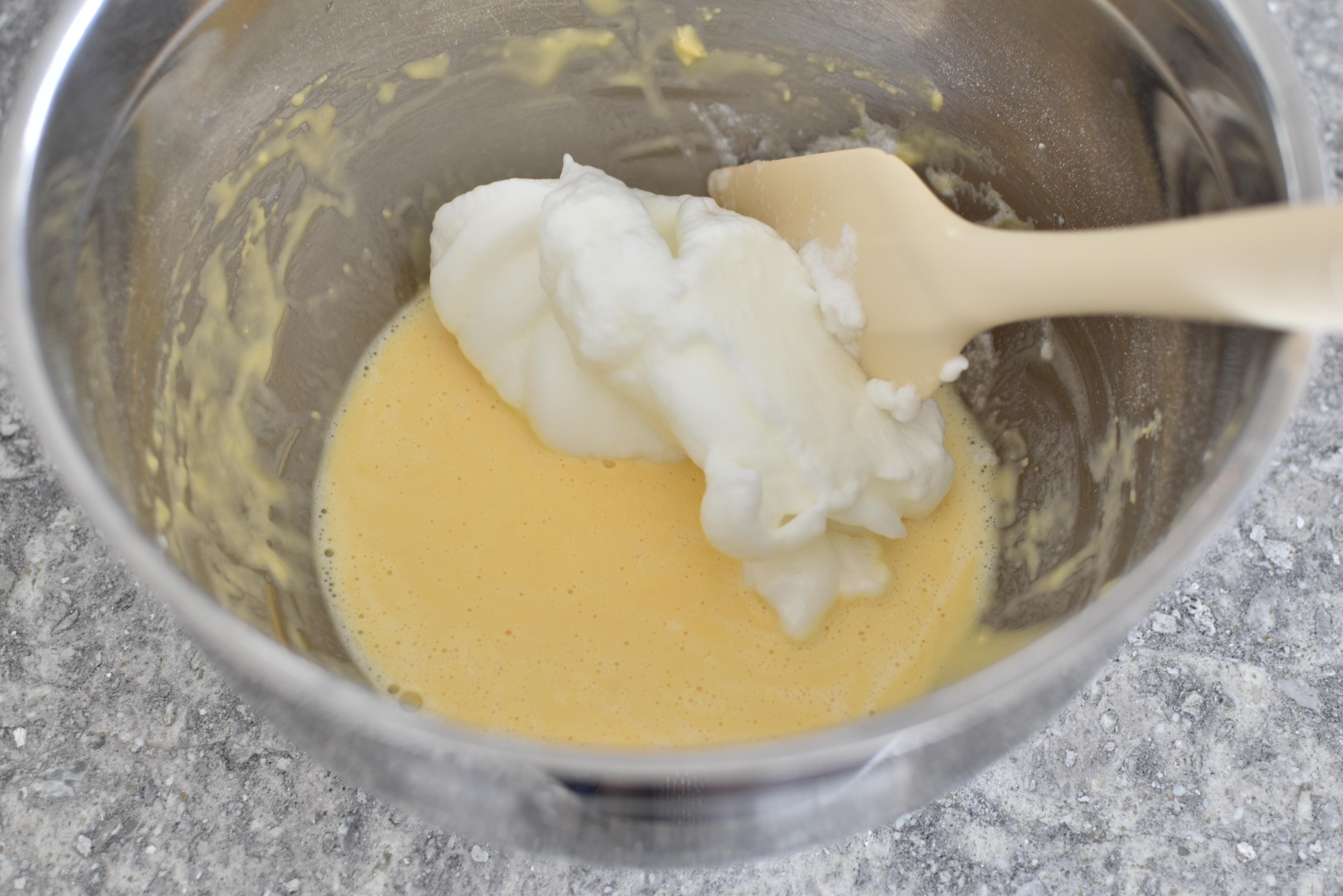 ベニエ生地を作る。卵黄と塩、炭酸水を混ぜ合わせ、ふるった薄力粉を少しずつ加えて更に混ぜる。卵白をメレンゲにして加え、ゴムベラでさっくりと混ぜ合わせる。