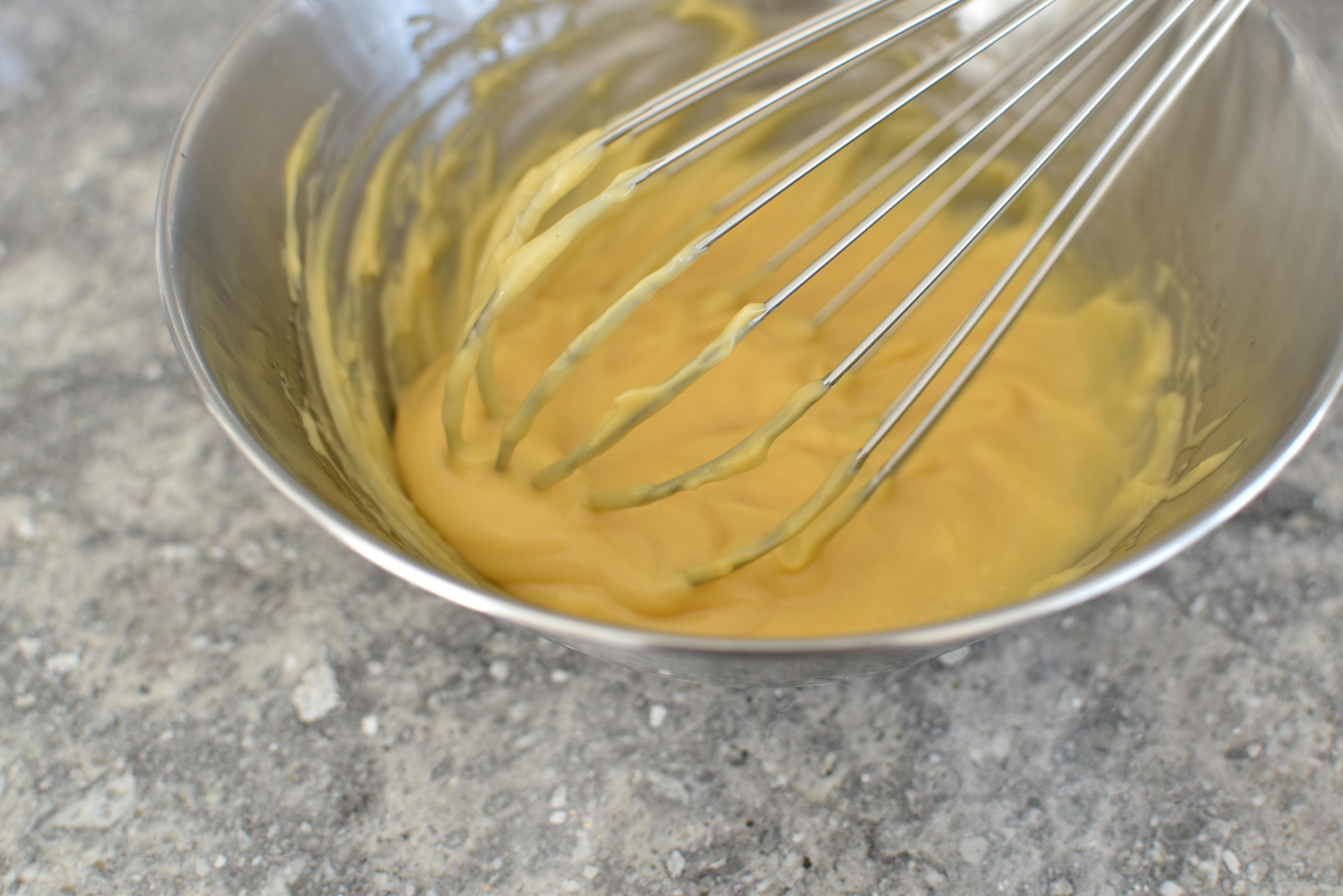 ボウルに卵黄とマスタードを入れてホイッパーで混ぜ合わせる。