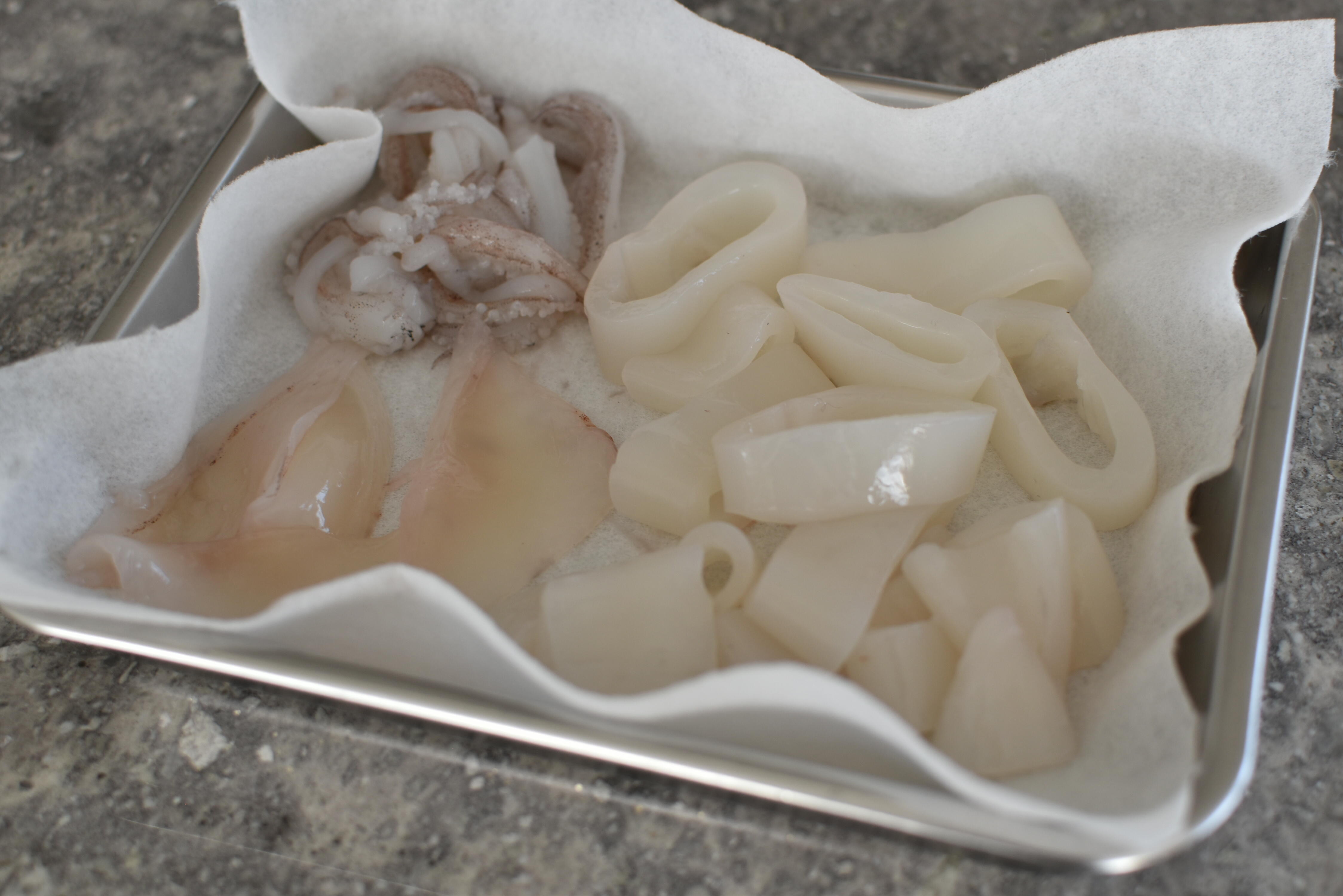イカはゲソとワタを抜き取り、軟骨も抜き取る。胴の中に内臓が少し残るので、手早く洗う。ゲソとワタを包丁で切り分ける。