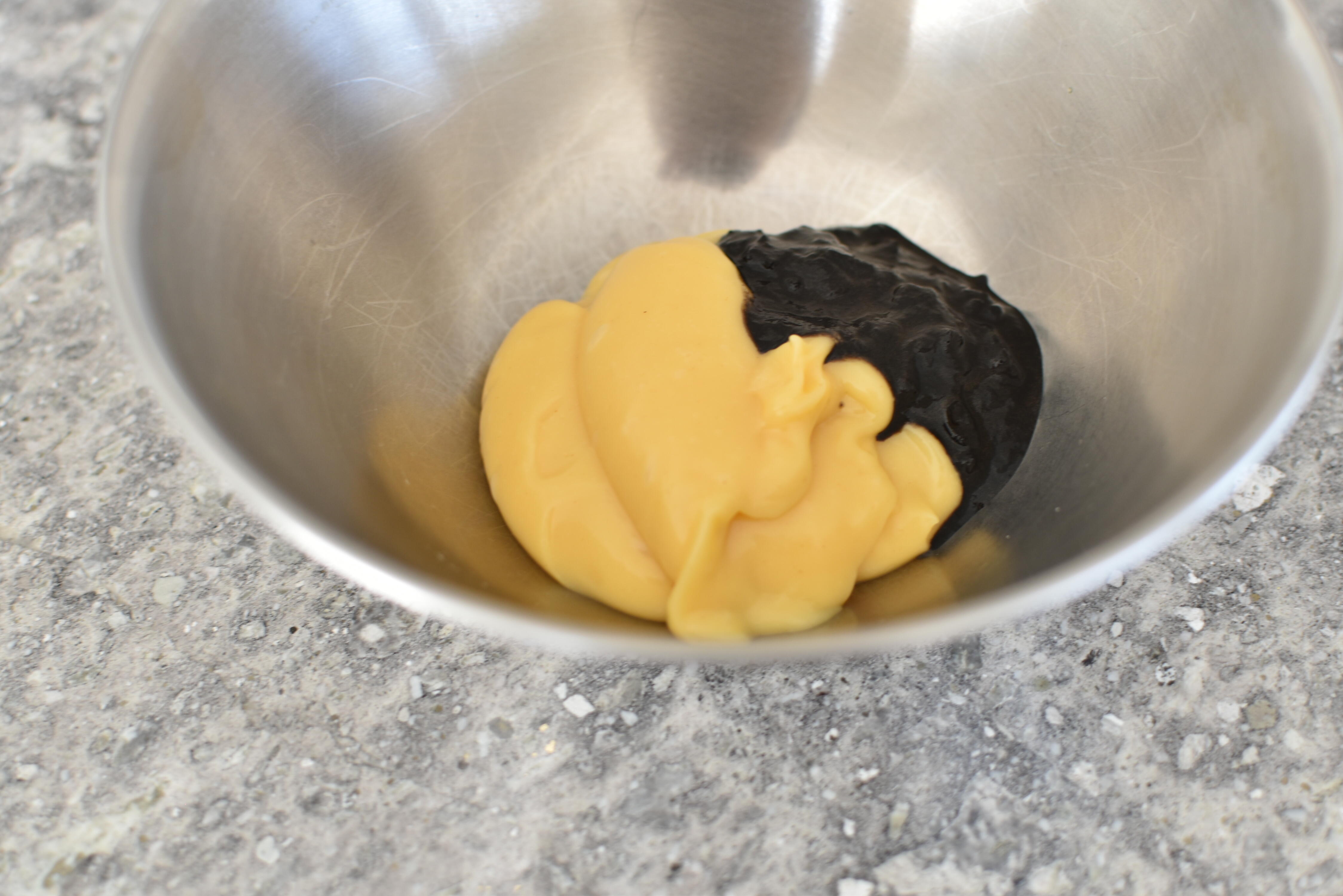 ①の自家製マヨネーズ50gに対しイカ墨トマトソース15gを混ぜ、イカ墨マヨネーズとする。お好みで塩で味を整える。