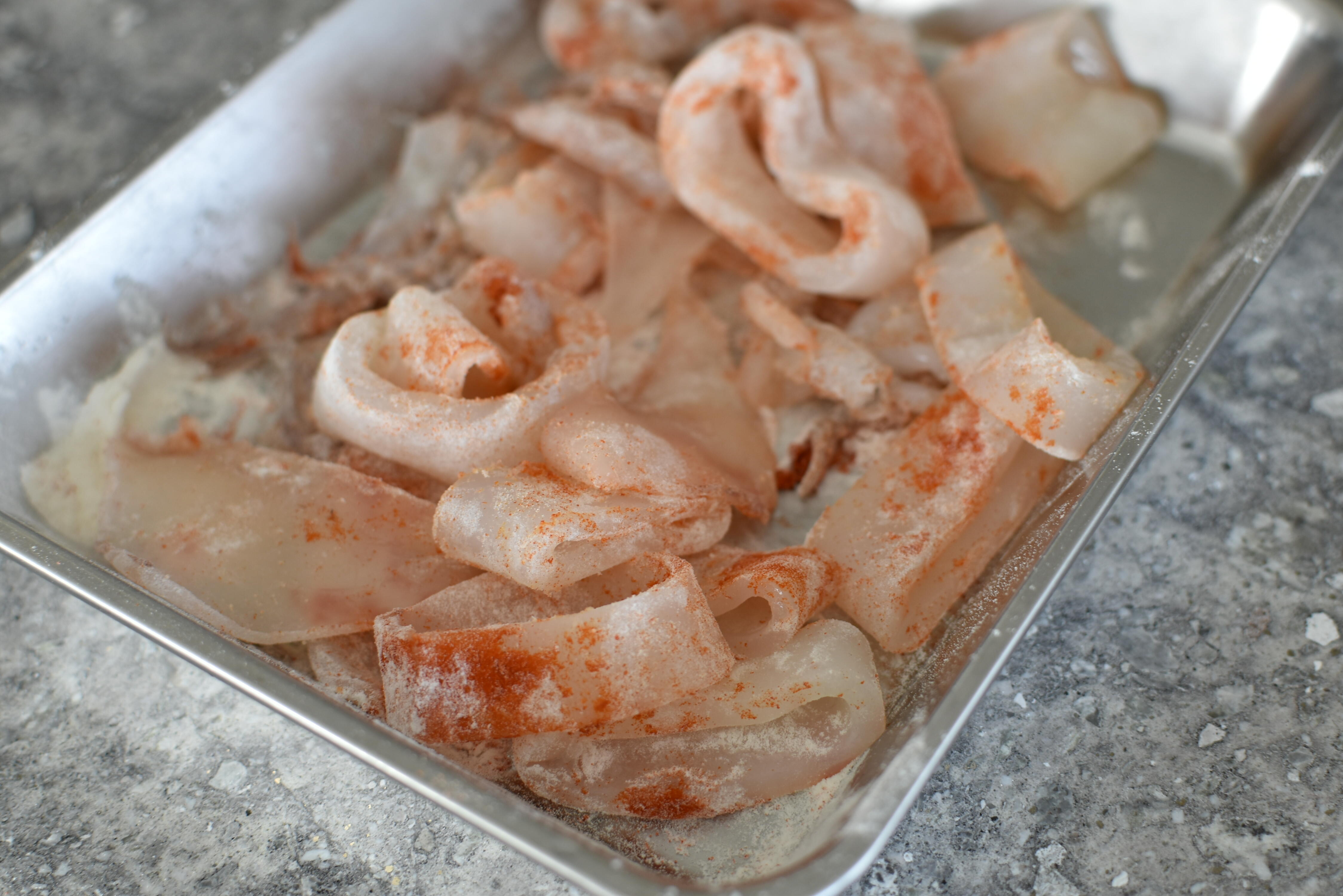 胴からエンペラを外す。皮を剥く。エンペラは適当な大きさに切り、胴は輪切りにする。