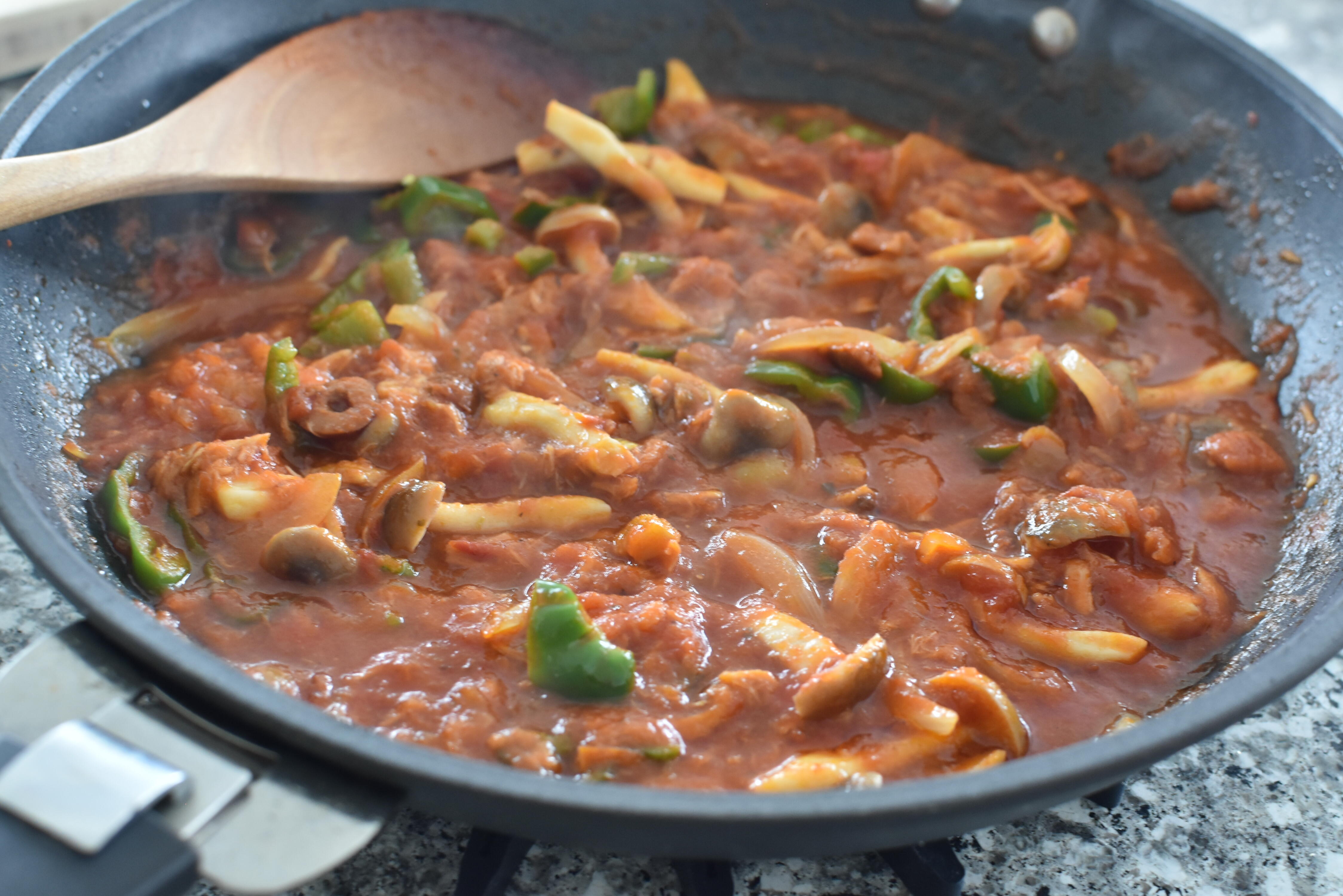 ブッタネスカソースと水を加え、沸騰したら中火弱で3分程軽く煮詰める。