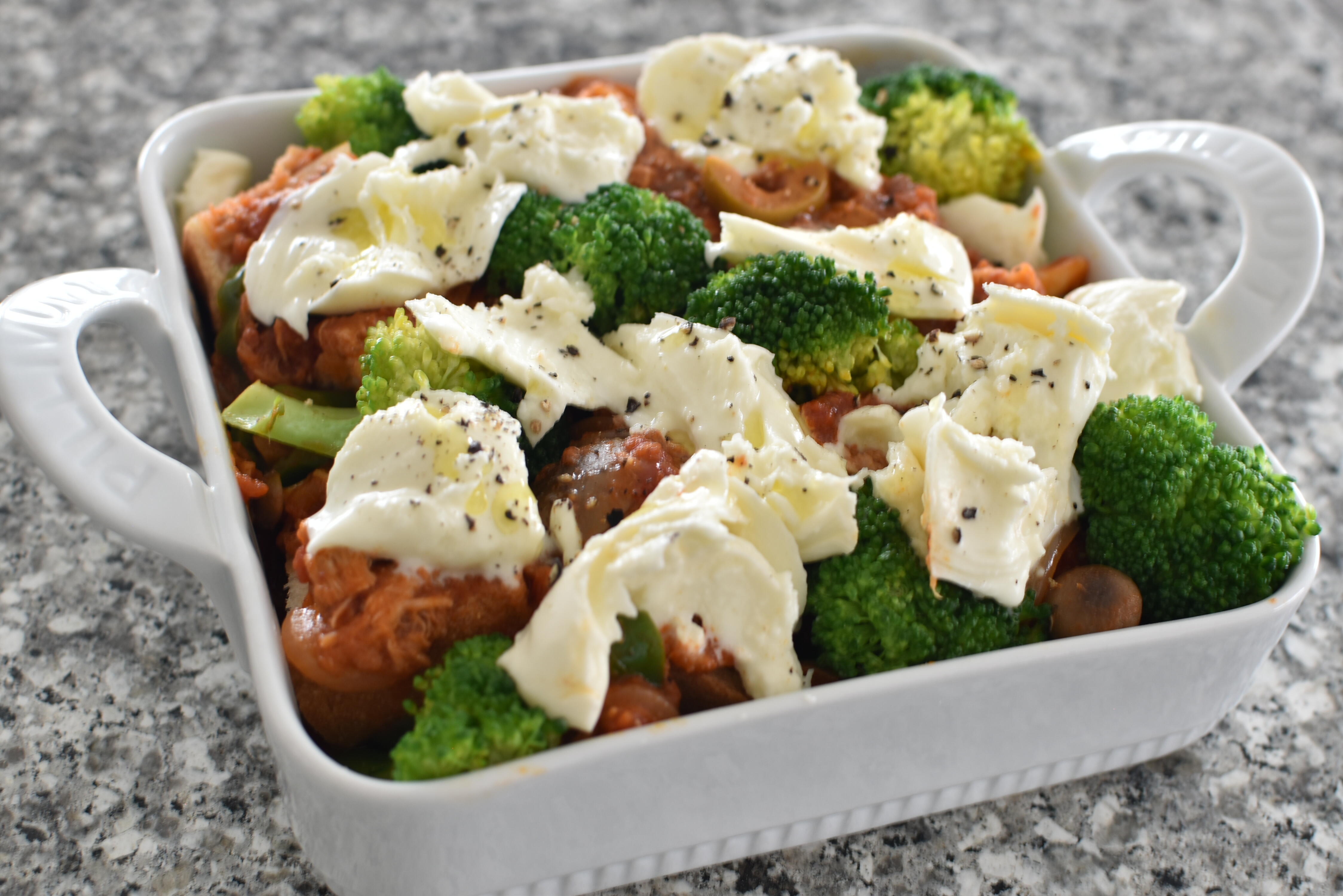 耐熱皿に⑥を少し広げ、その上に①のバゲットと④のブロッコリーをのせる。残りの⑥を上から流し入れる。モッツァレラチーズを手でちぎってのせて、黒胡椒を少々ふり、オリーブオイル(分量外)を回しかける。