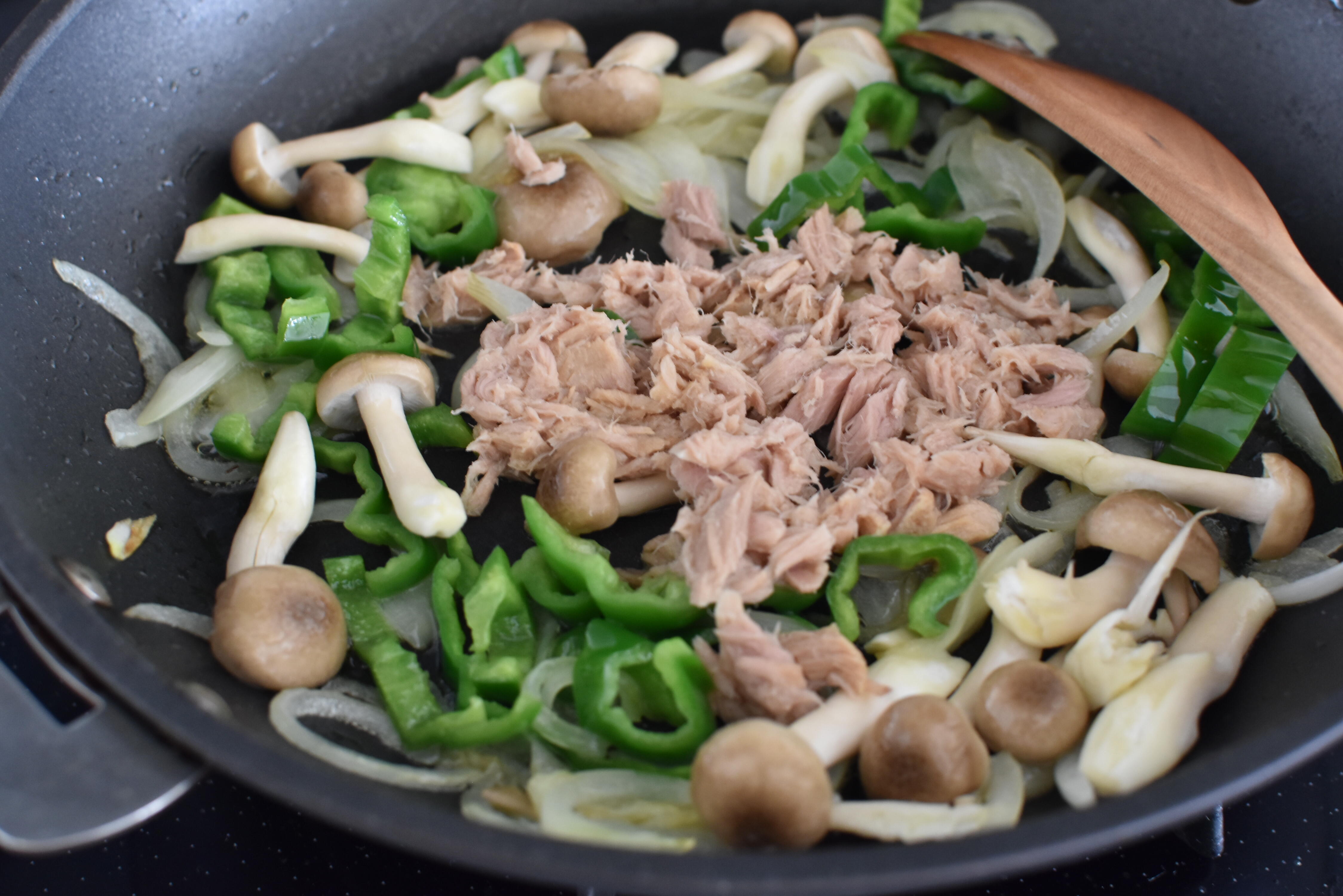 フライパンに分量のオリーブオイルを熱し、玉ねぎを炒める。しんなりしたら、ピーマン、しめじ、ツナの順に加えて炒める。