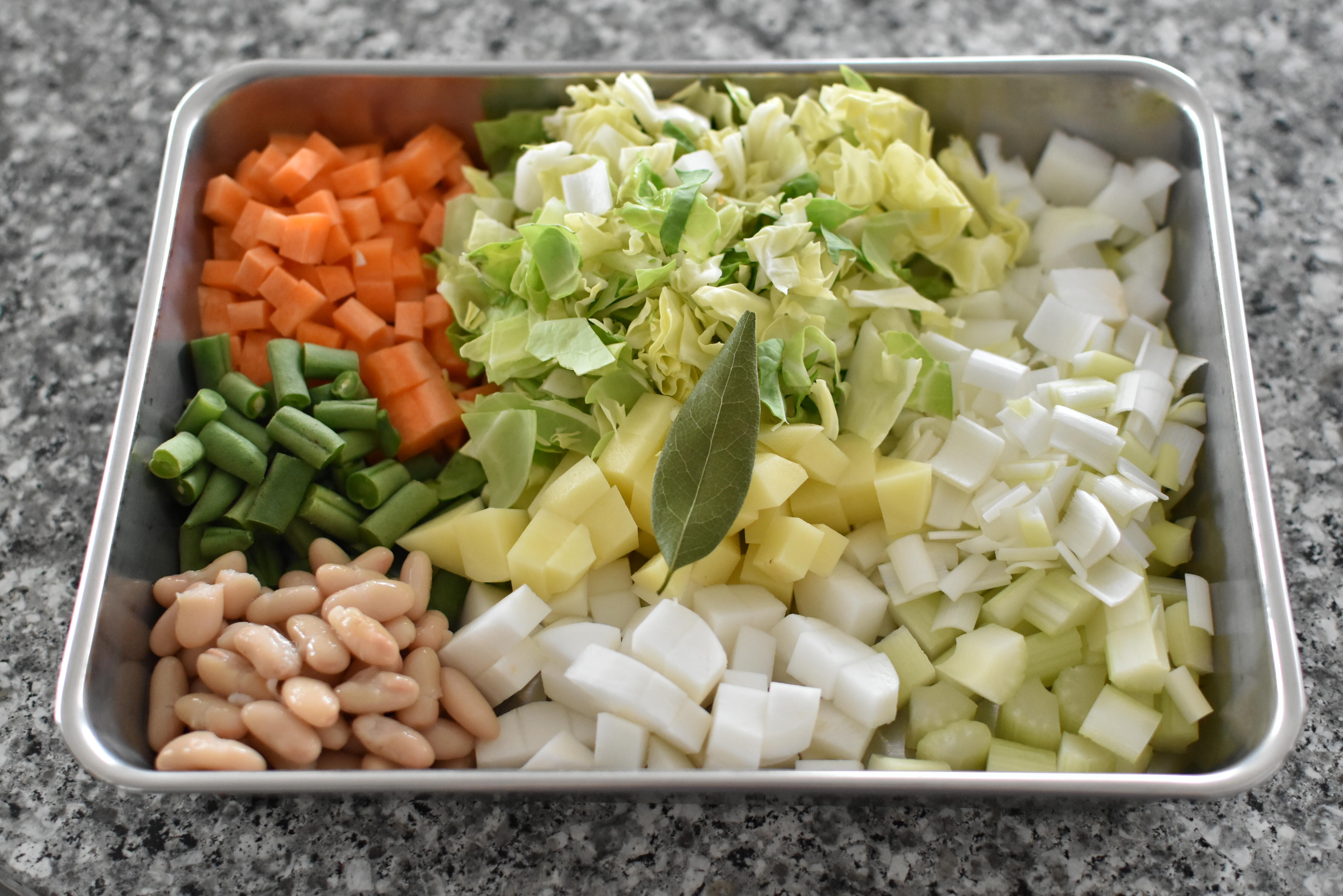 鍋にオリーブオイルを温め、かぶと白いんげん豆以外を炒める。塩をひとつまみ加え、蓋をしてごく弱火で15分程蒸し煮にして、野菜の甘みを存分に引き出す。