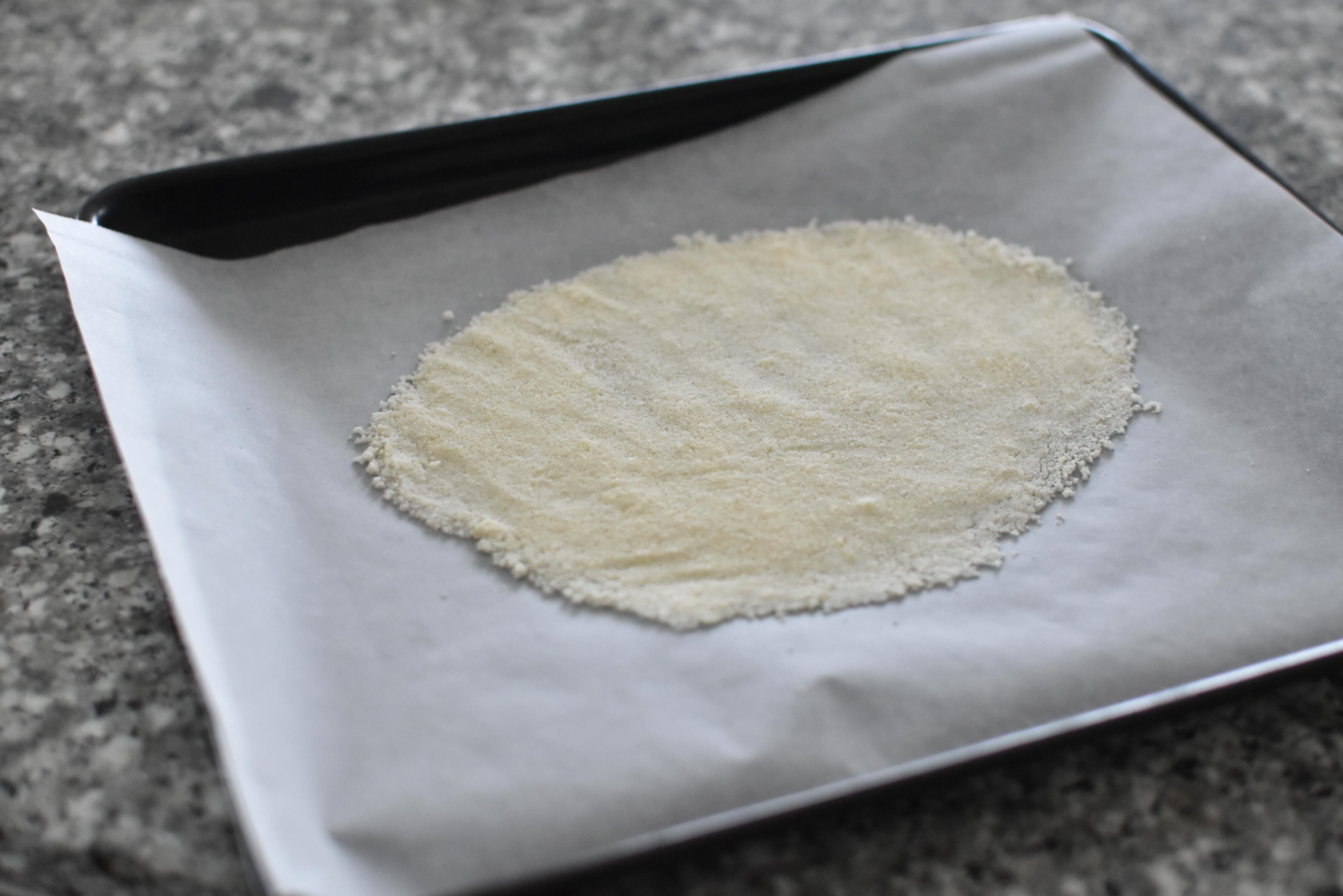 焼きチーズを作る。オーブンを200℃に予熱する。オーブンシートの上に、パルミジャーノのすりおろし又は粉チーズを隙間なく広げ、予熱したオーブンで約7分焼成する。網に取り、粗熱を取る。