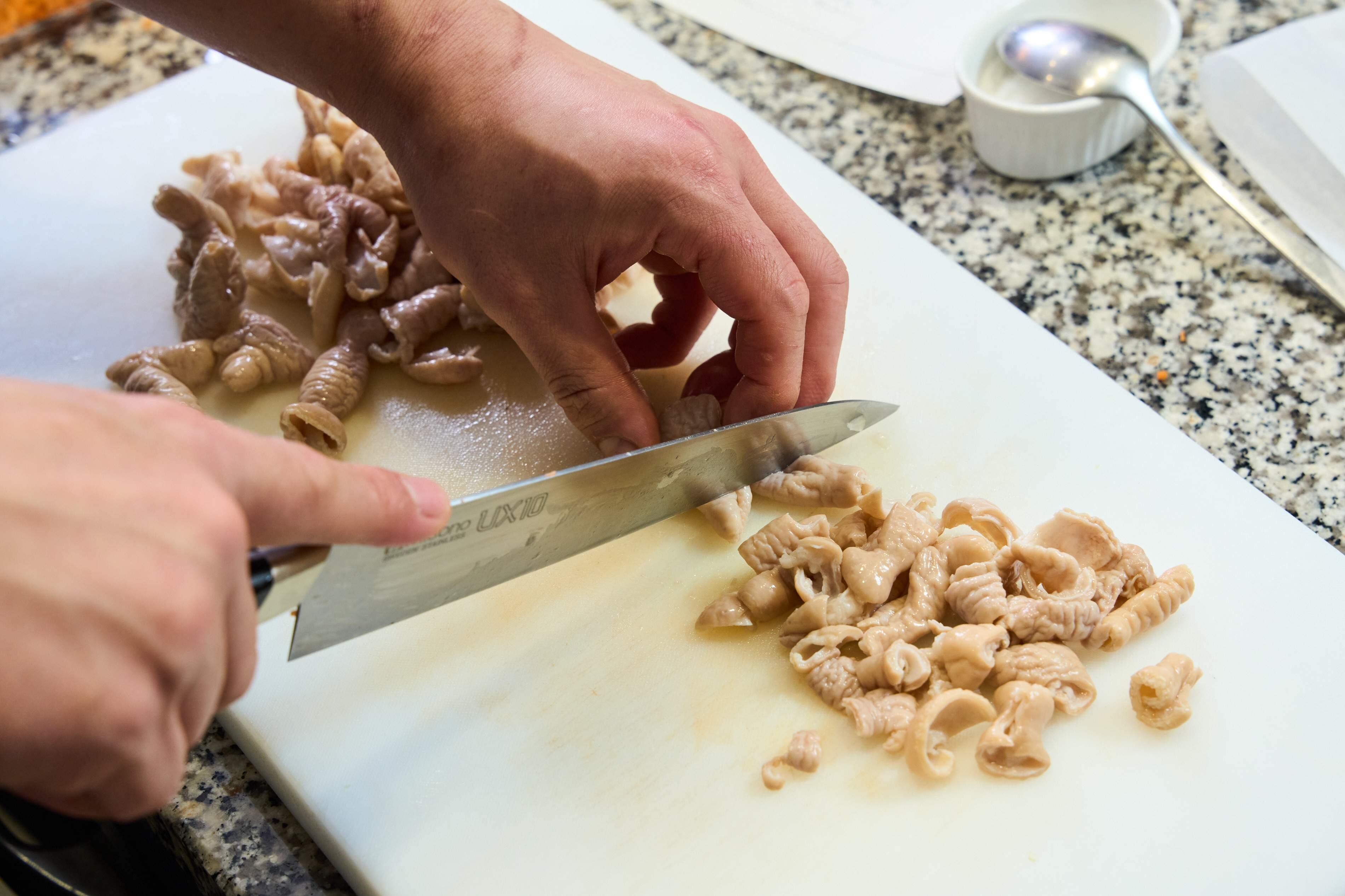 白モツを1回ボイルし、ざるにあけ水洗いし1口大にカットする(臭みを消すため)
