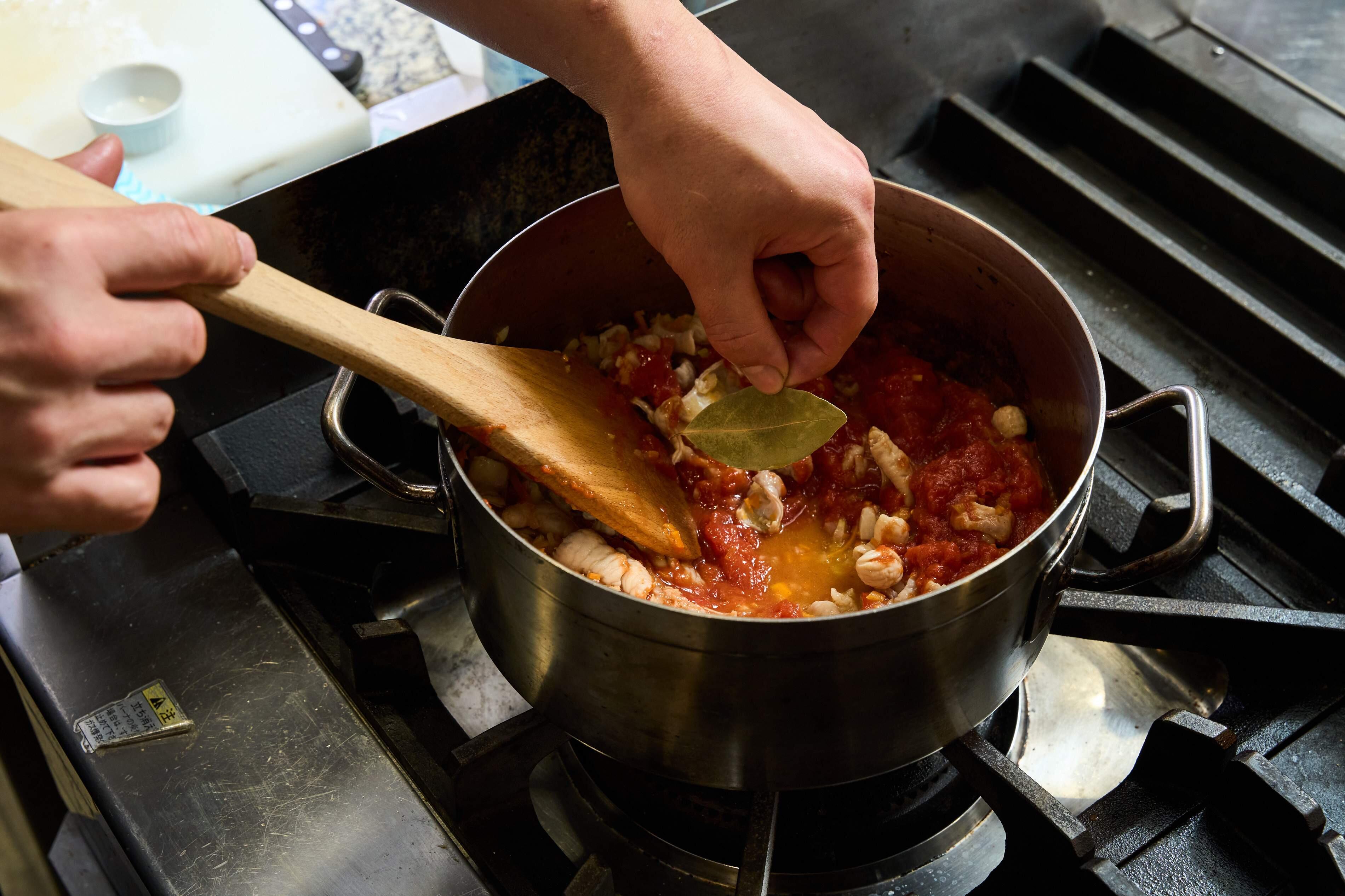 ローリエと、トマト缶のトマトを汁ごと加え、つぶしながら弱火にかける(途中アクがでるようだったら取り除く)