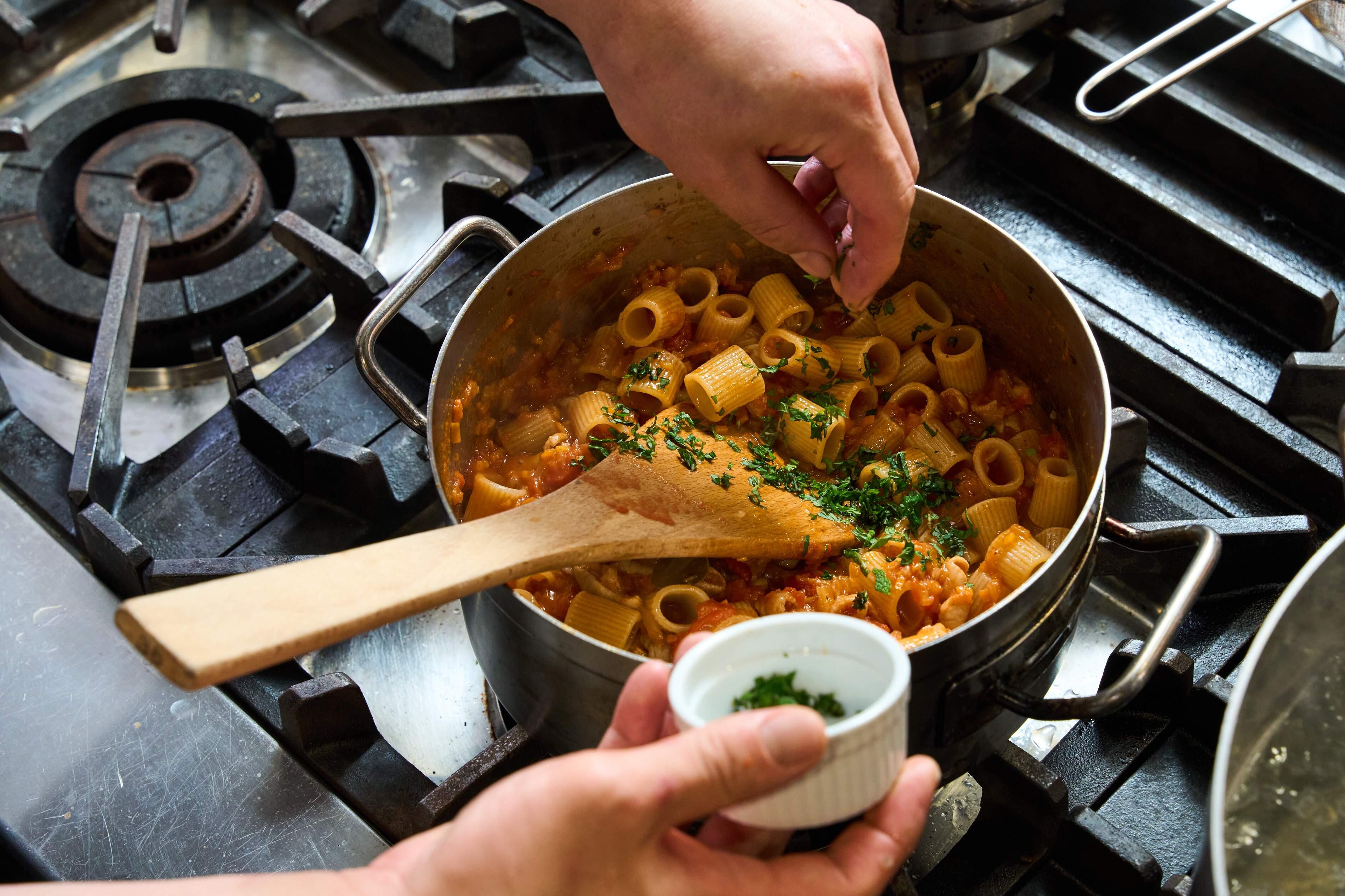 ソースが出来たら、茹で上がったパスタを混ぜ合わせ、刻んだスペアミント加える。オリーブオイルを回しかける。