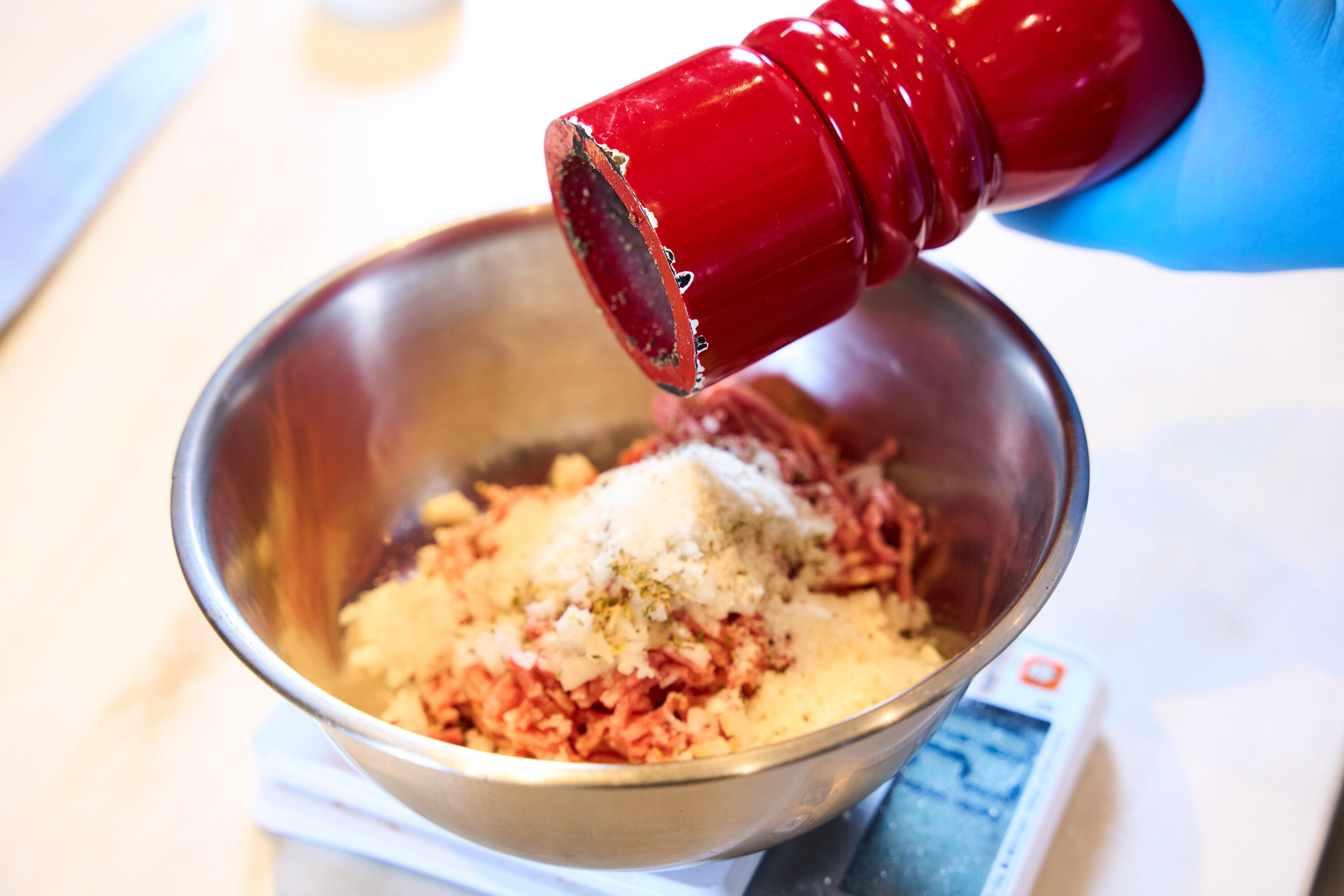 ボウルに合い挽き、ドライオレガノ、みじん切りにした玉ねぎ、パルメザンチーズ、塩胡椒をいれ、ひとまとまりになるまでこねる。