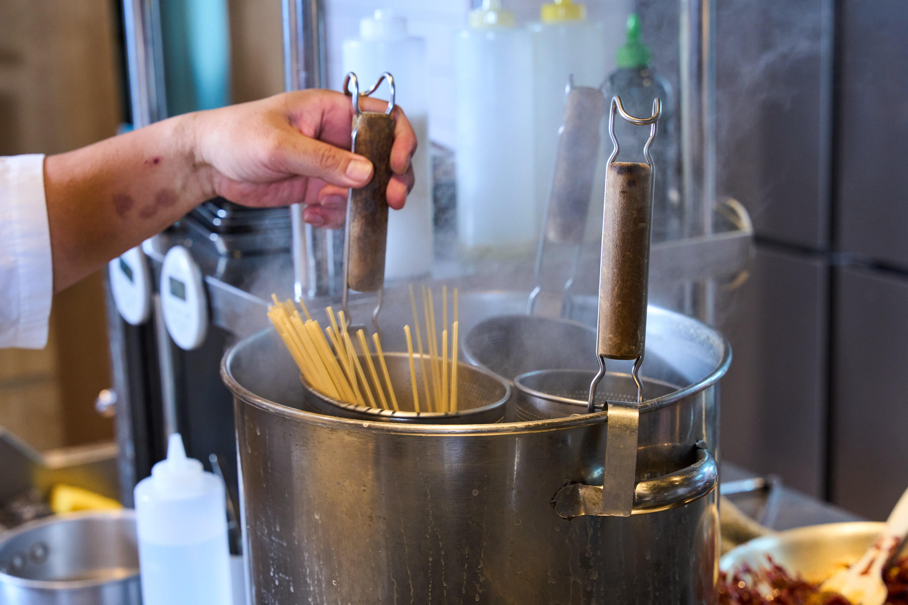 塩を加えたたっぷりのお湯で、スパゲッティを茹で始める。(約9~11分)
