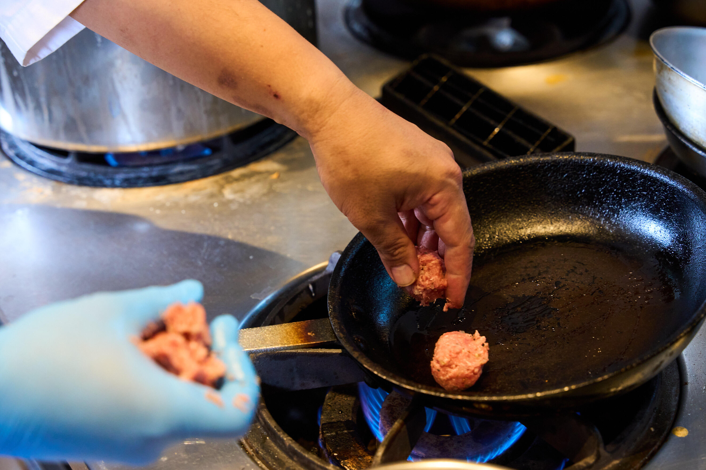 オリーブオイルを入れ熱したフライパンに、つくねをつくる要領で、お肉を一口大のボールにして並べる。