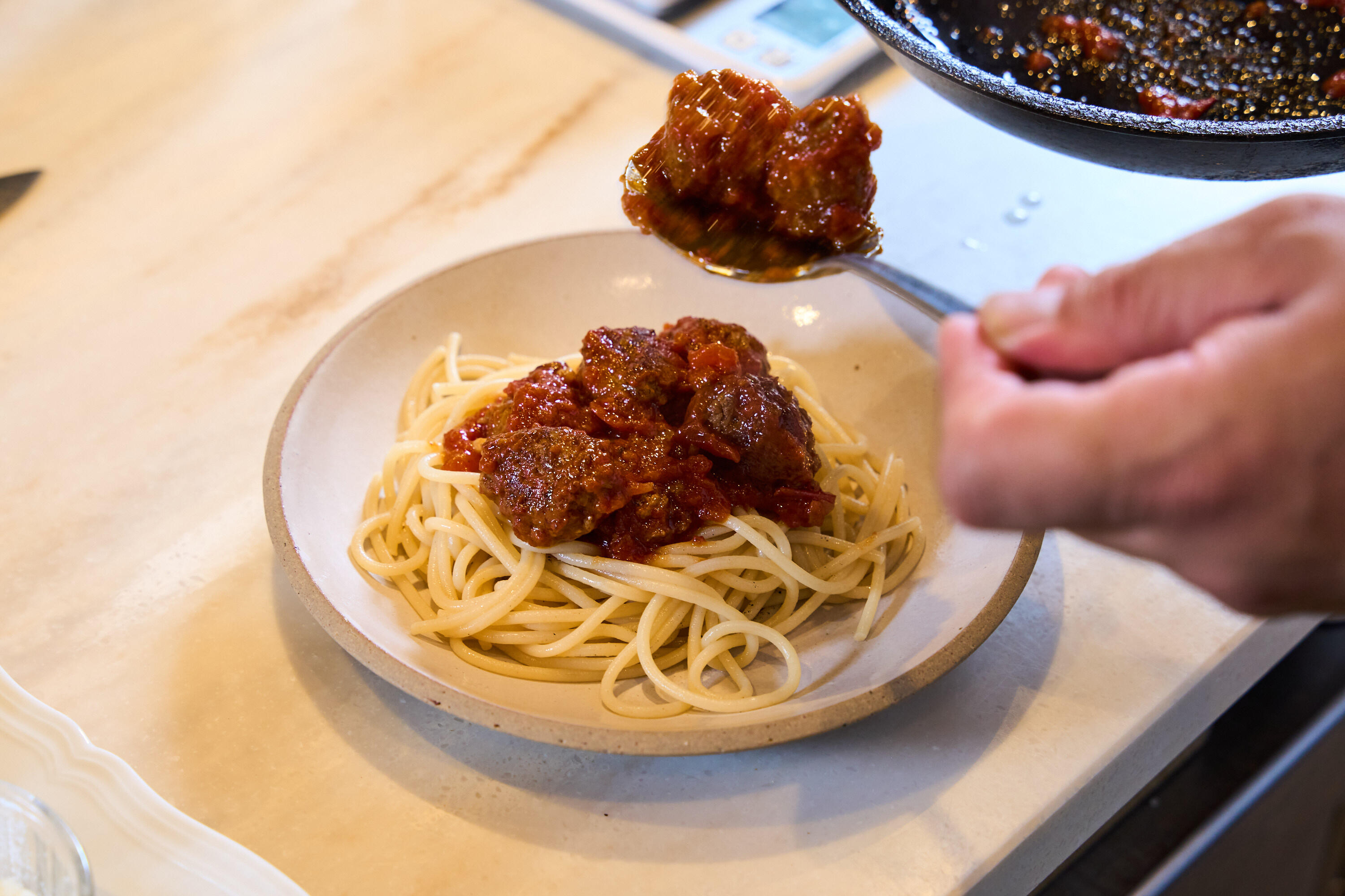 茹で上がったスパゲッティを皿に盛り、その上にミートボールとソースをかける。