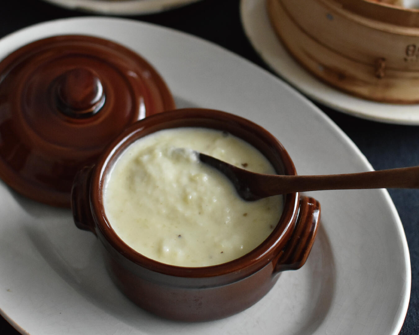 チキンブイヨンと①のゴルゴンゾーラを溶かした生クリームを加え、ひと煮たちさせたら弱めの中火にして蓋をし、10~12分ほど鶏肉に火を通す。