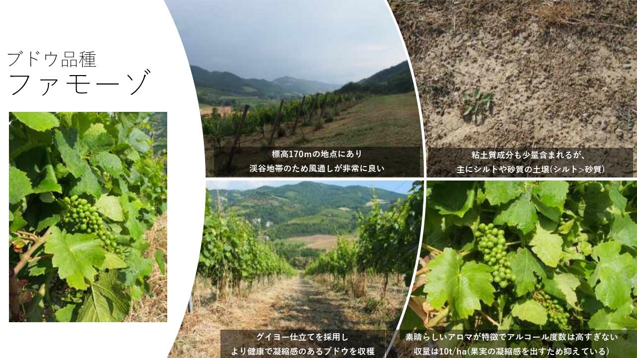 とてもアロマティックな品種として知られるファモーゾは1400年代から栽培されていた歴史あるエミリア・ロマーニャ州の土着品種でしたが、栽培が難しい=大量生産ができない、アロマが強く辛口が好まれるマーケットでは不人気であったため一時期忘れ去られていました。しかしそれをネスポリ社や地元の生産者が再び掘り起こし、ここ20年~30年良質なファモーゾワインの生産に繋げています。